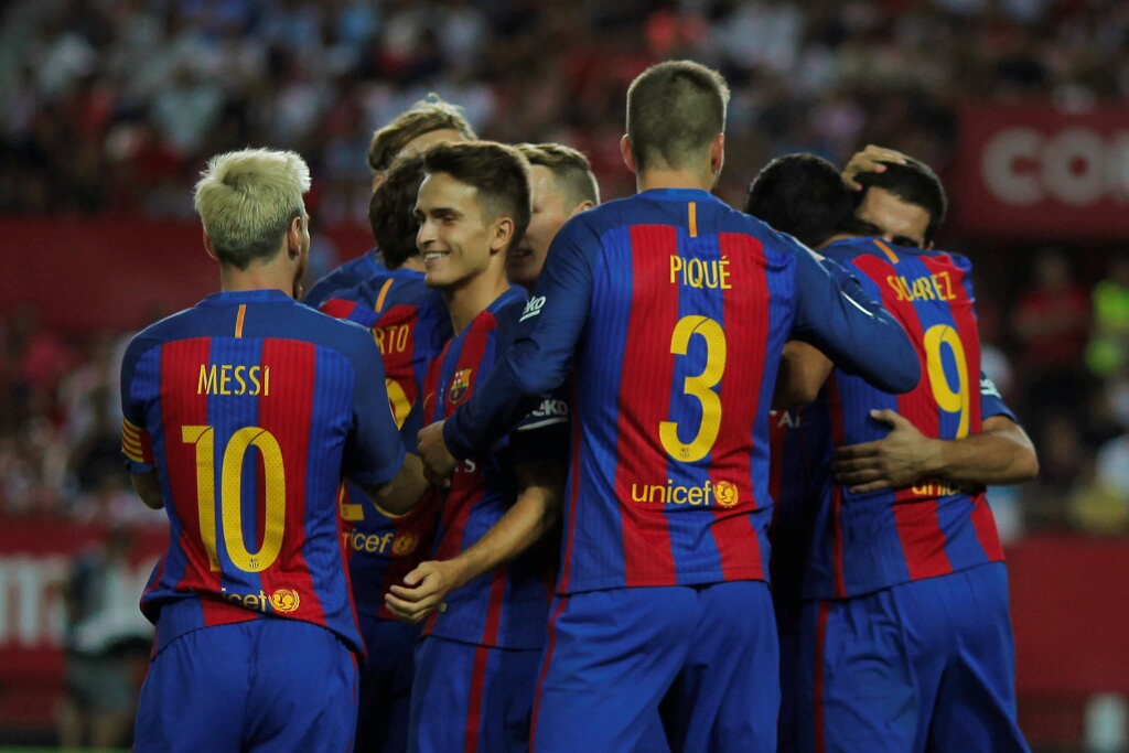 | Barça players celebrate a goal against Sevilla in the 2016 Spanish Super Cup |