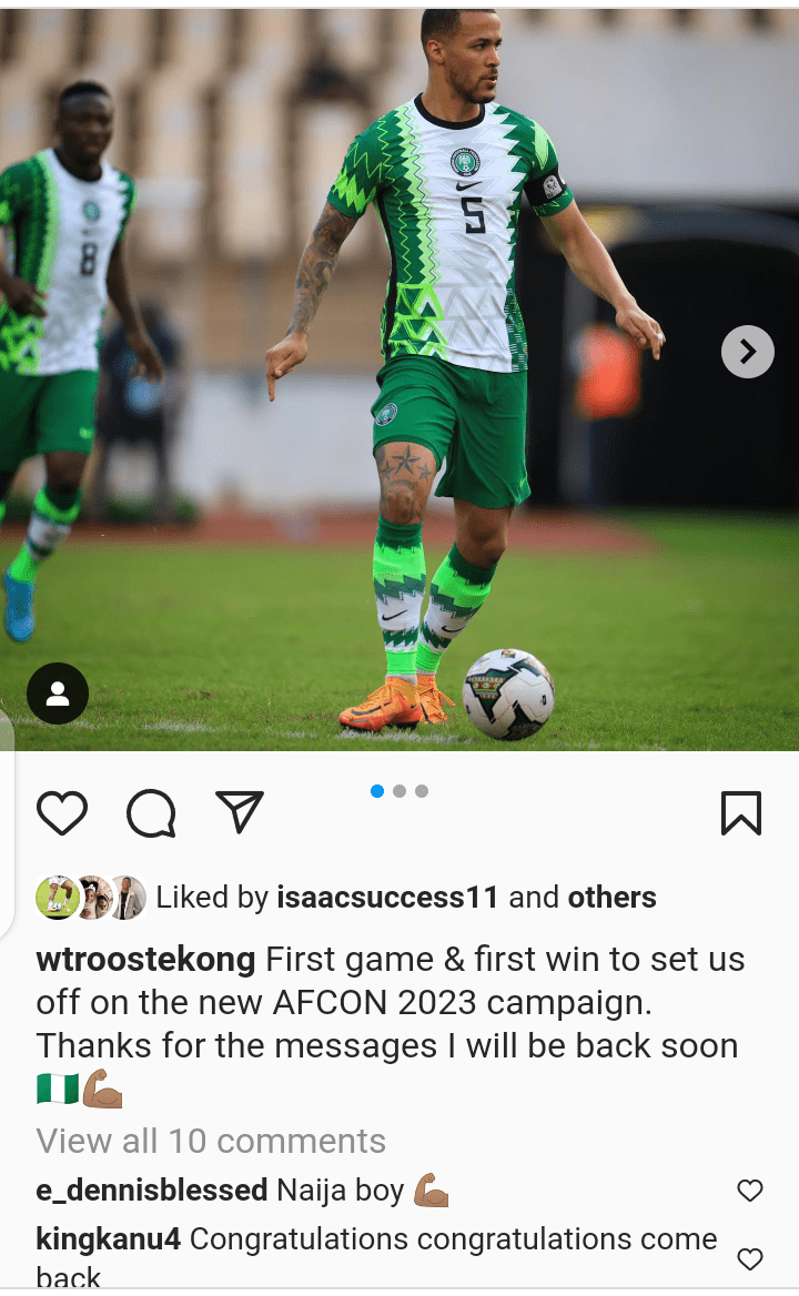 Despite his setback, Troost-Ekong expressed his pleasure at the team's success, posting on Instagram: “First game and first win to set us off on the new AFCON 2023 campaign. Thanks for the messages. I will be back soon.”