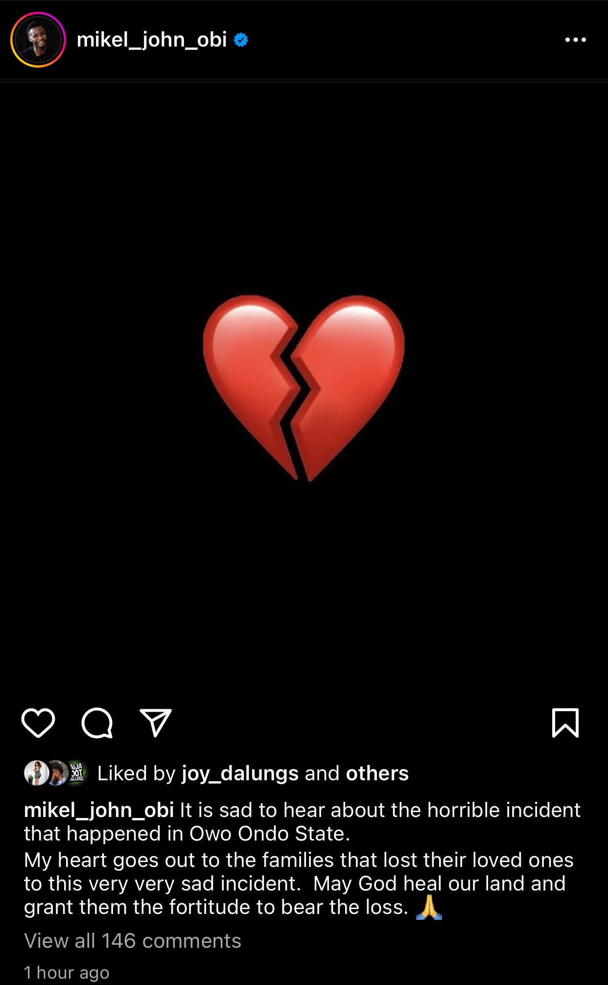 Former Super Eagles captain, Mikel Obi sent his condolences to the people of Owo in an Instagram post.