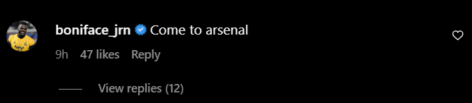 After reacting to a post the Nigerian youngster shared on his social media feed, Union SG forward Boniface suggested the Premier League's top team as a potential destination for the player.