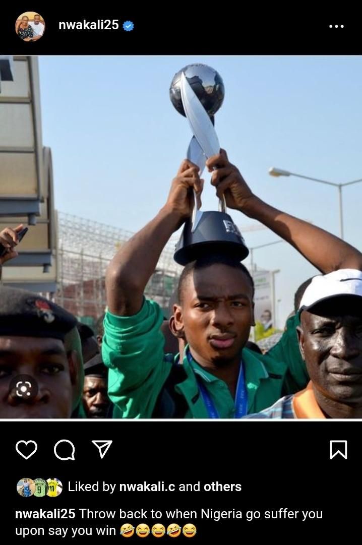 The Nigerian international shared a photo of himself carrying the World Cup trophy on his head, followed by a section of joyous Nigerian supporters with the caption: “Throwback to when Nigeria go suffer you upon say you win.”