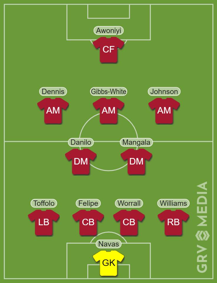 A trio of players like Dennis on the left, Morgan Gibbs-White at his preferred number 10, and Brennan Johnson on the right would be anticipated to create all kinds of issues as Awoniyi would be expected to lead the line in the assault.