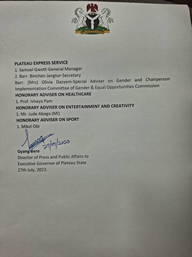 This news comes as part of a series of appointments, as revealed by Mr. Gyang Bere, the governor's Director of Press and Public Affairs, in a statement released on Thursday in Jos.