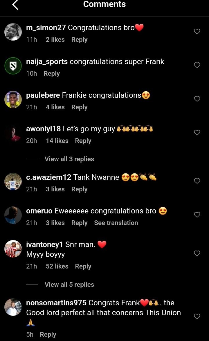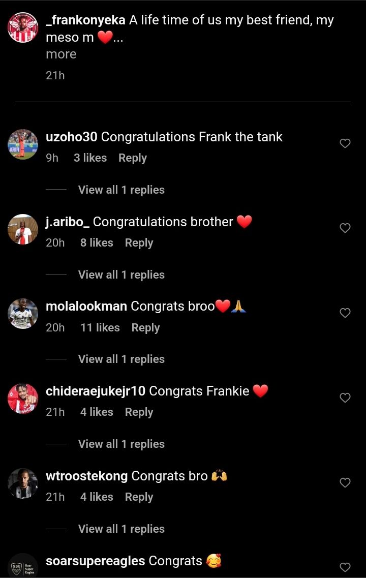 Terem Moffi joined the chorus, jubilantly exclaiming, “Congratulations my guyyyyyy,” while Chidozie Awaziem playfully wrote, “Tank Nwanne,” and Paul Onuachu kept it simple with “Frankie Congratulations.”