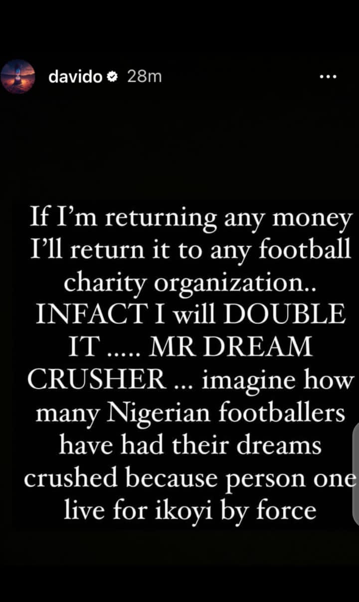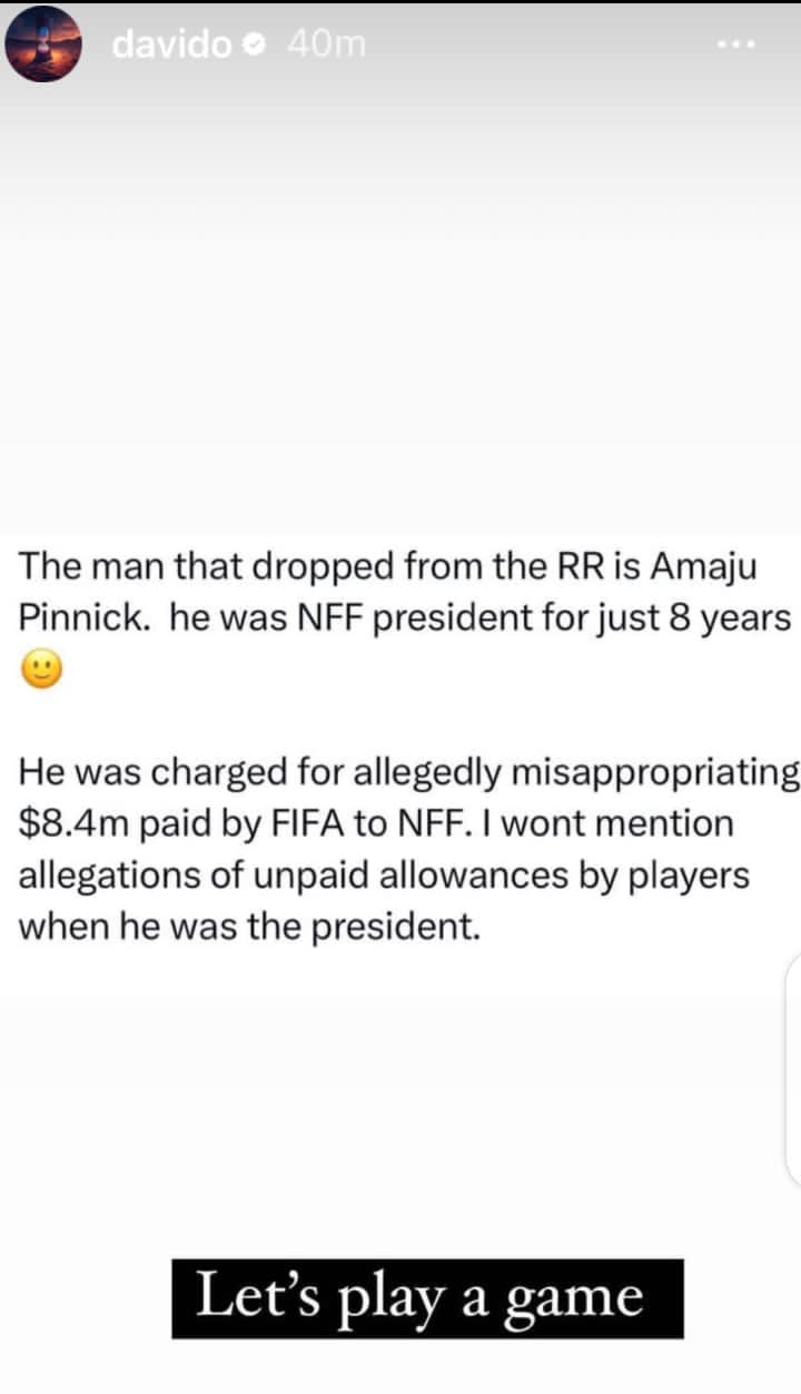 “The man that dropped from the RR is Amaju Pinnick. He was NFF president for just 8 years. He was charged for allegedly misappropriating $8.4m paid by FIFA to NFF. I won't mention allegations of unpaid allowances by players when he was the president,” Davido wrote.