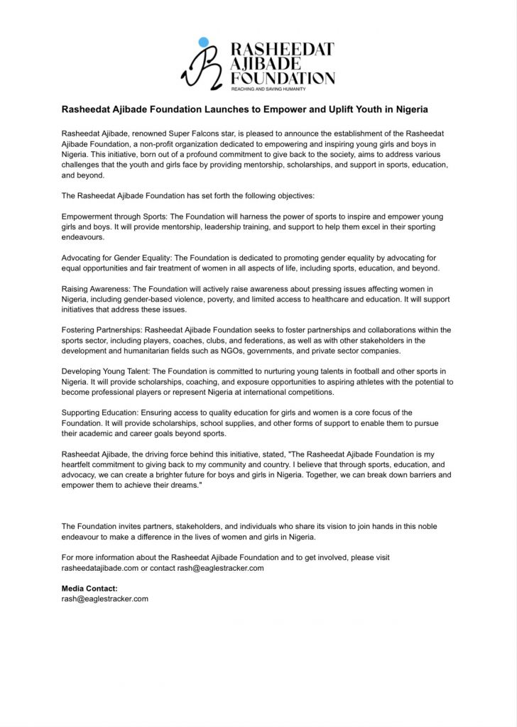 Super Falcons star Rasheedat Ajibade has launched the Rasheedat Ajibade Foundation, RAF, an initiative to empower and uplift Nigerian youths, Soccernet.ng reports.