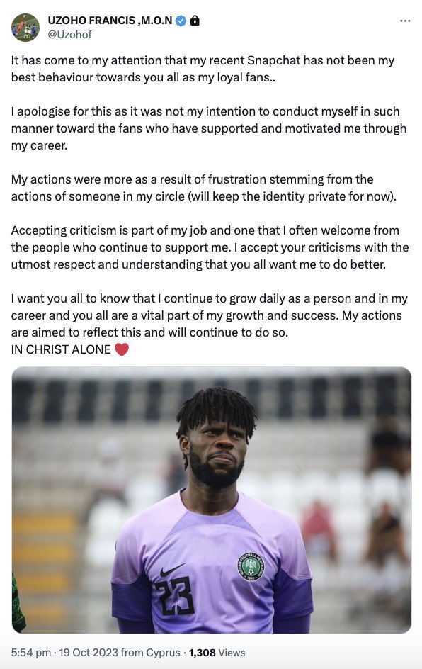 “It has come to my attention that my recent Snapchat has not been my best behaviour towards you all as my loyal fans. I apologize for this as it was not my intention to conduct myself in such a manner towards the fans who have supported and motivated me throughout my career,” Uzoho posted on X.