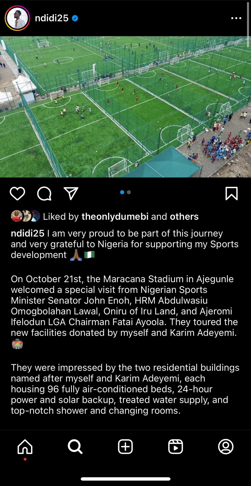 “On October 21st, the Maracana Stadium in Ajegunle welcomed a special visit from Nigerian Sports Minister Senator John Enoh, HRM Abdulwasiu Omogbolahan Lawal, Oniru of Iru Land, and Ajeromi Ifelodun LGA Chairman Fatai Ayoola. They toured the new facilities donated by myself and Karim Adeyemi.