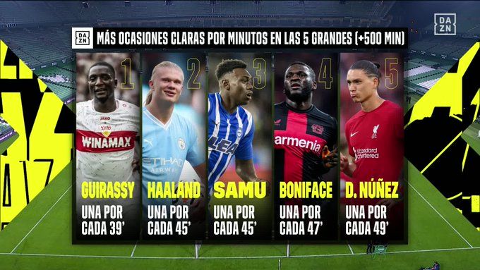 Bayer Leverkusen star Boniface, who creates a chance every 47 minutes, is fourth on the chart behind the duo of Omorodion and Manchester City's Erling Haaland (45 minutes) and top man, Stuttgart's Guirassy (39 minutes). Liverpool forward Darwin Núñez (49 minutes) arrives in fifth place.