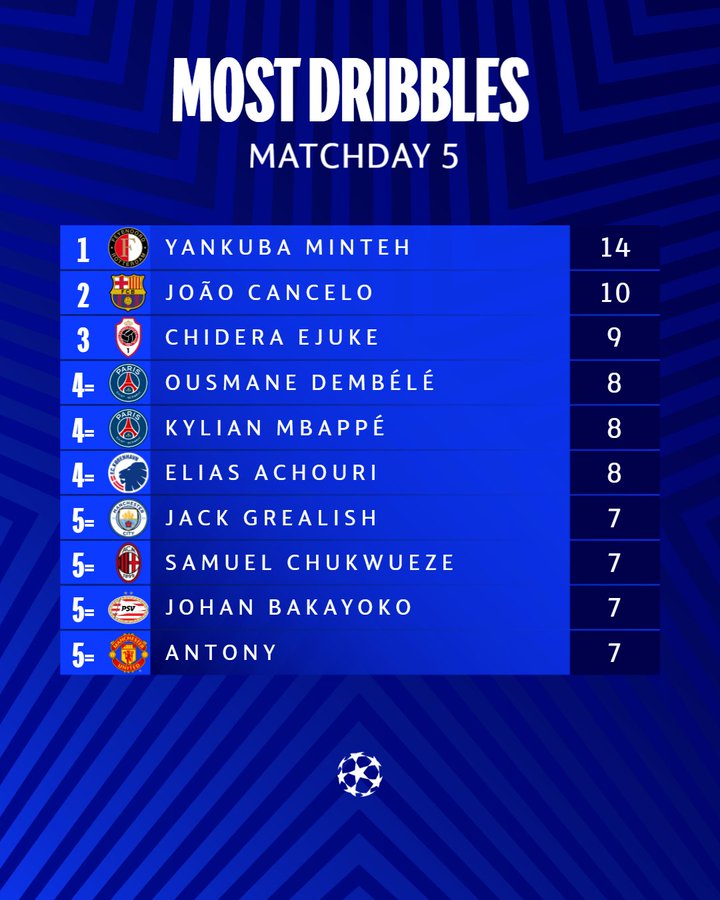 Ejuke outshone the Paris Saint-Germain duo of Ousmane Dembele and Kylian Mbappe, as well as FC Copenhagen's Elias Achouri, who completed eight successful dribbles each.