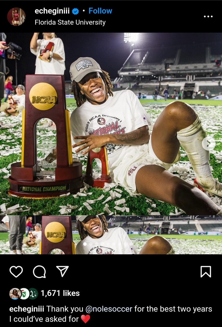 The development comes after Echegini signalled her departure from the Florida State women's soccer team in December following the end of her two-year stint, capping off an illustrious chapter in her collegiate career.