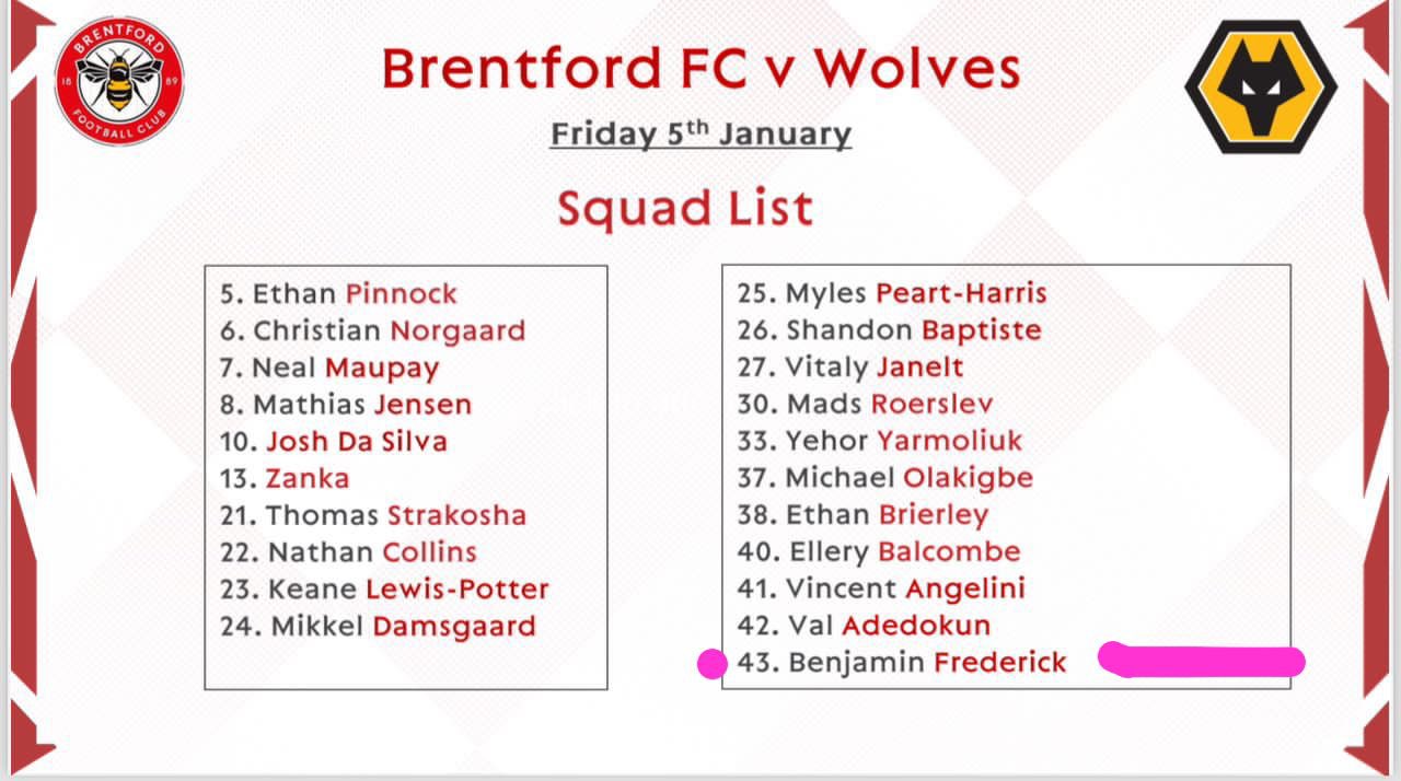 Brentford have revealed their squad for their round of 64 game against Wolves in the FA Cup, and Frederick was included.