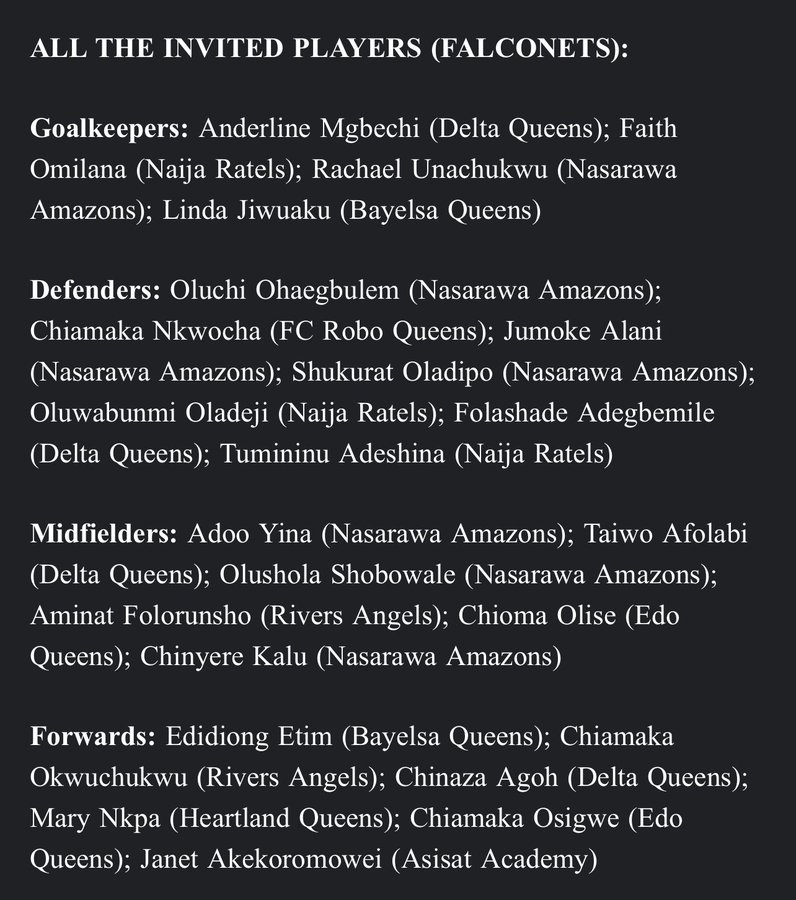 The released list includes thirty Falconets who ply their footballing trade in Nigeria. Twenty-nine of them already play for Professional sides, and one plays for the prestigious Asisat Oshoala academy.