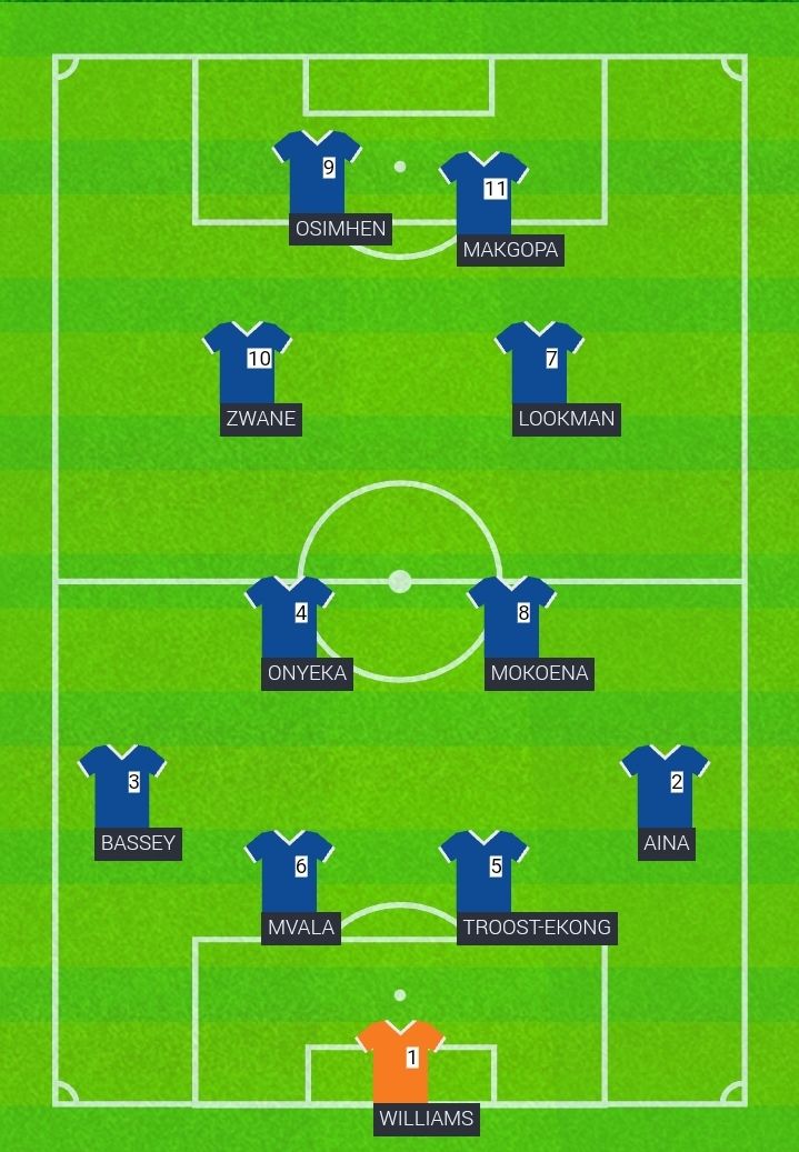Ronwen Williams; Ola Aina, William Troost Ekong, Mothobi Mvala, Calvin Bassey; Teboho Mokoena, Frank Onyeka; Ademola Lookman, Themba Zwane; Victor Osimhen, Evidence Makgopa.