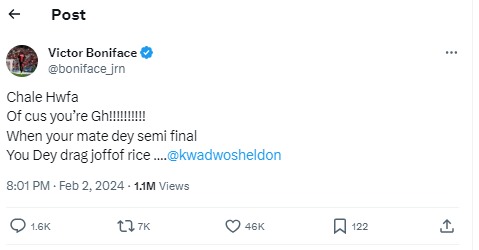 And the jokes and teasing are not just a fan affair, as some players join in the conversation and take the game to a different level through their amusing performance of elite pettiness. Beyer Leverkusen’s Victor Boniface, who departed the Nigerian camp after picking up one of a string of injuries that hit the Nigerian camp just before the start of the games is at the heart of some of these jokes. Responding to a Ghanaian YouTube personality and content creator Kwadwo Sheldon who said in a video that Ghanaians “can’t allow Nigerians to win #AFCON” because Nigeria already dominates Afrobeats and keeps dragging Jollof Rice with Ghana, Boniface fired back, mocking the Ghanaian team: “your mate dey semifinal, you dey drag joffof [Jollof] rice.”