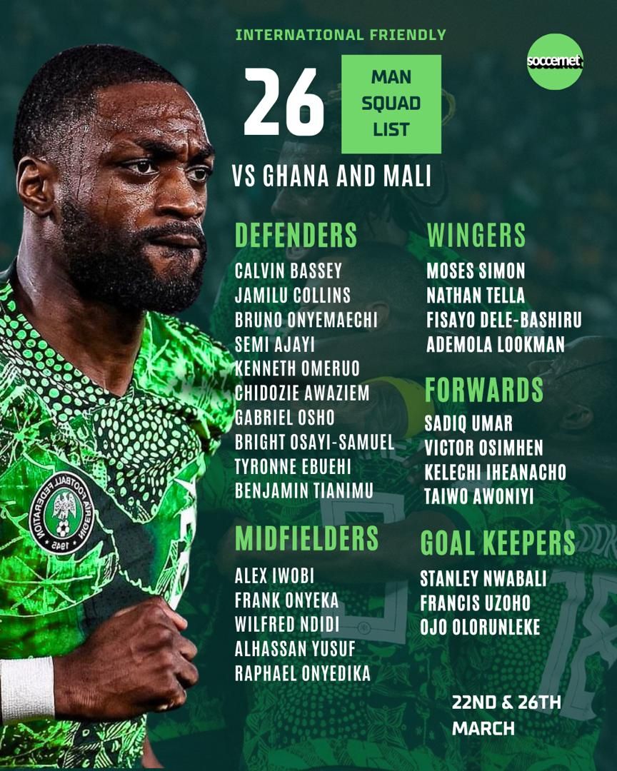 The bulk of Nigeria's 25-man squad to the AFCON has made the roster for the games against Ghana and Mali.
