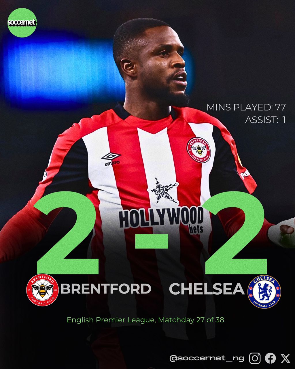 In the Premier League, Frank Onyeka served an unconventional assist for Yoane Wissa to net Brentford's second goal in their 2-2 draw with Chelsea.