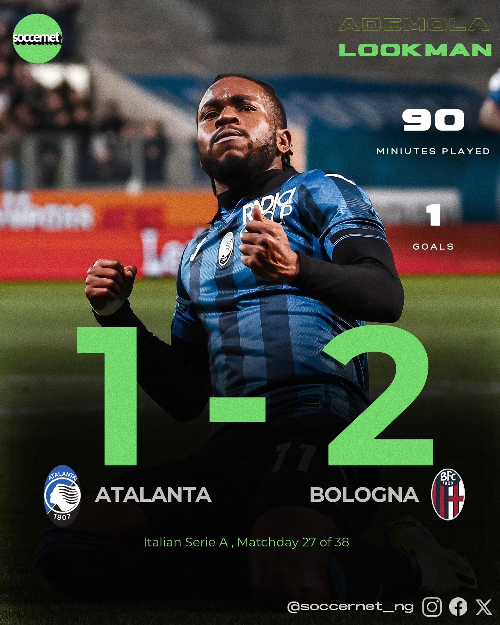 Atalanta were stunned 1-2 at home by Bologna with Ademola Lookman netting his first of the year for the home side while Joshua Orobosa Zirkzee was among the goals for the visitors.