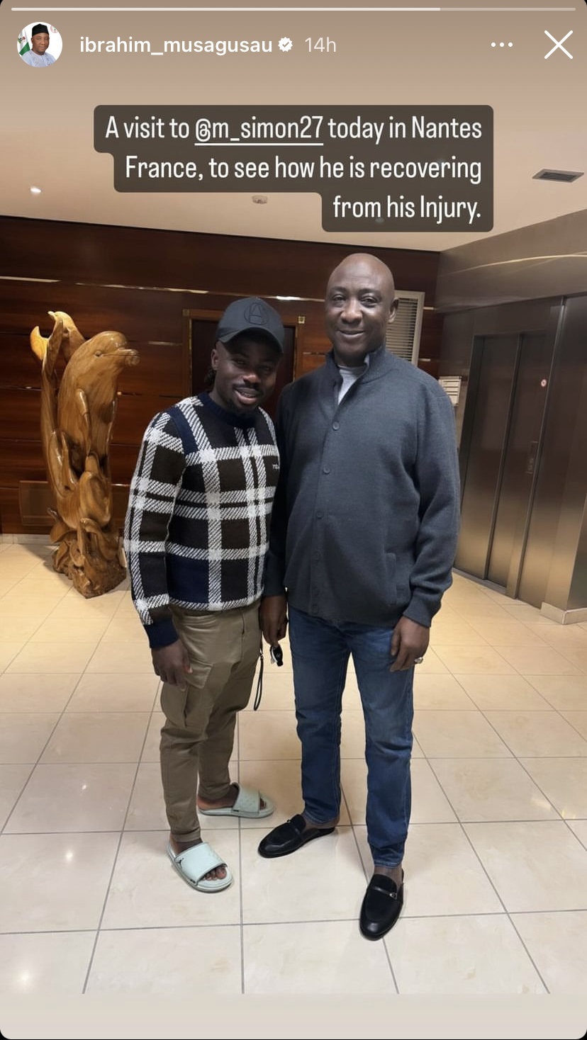 As part of his efforts to check on the welfare of players, NFF President Ibrahim Gusau visited Moses Simon in Nantes, France, to assess his recovery progress.