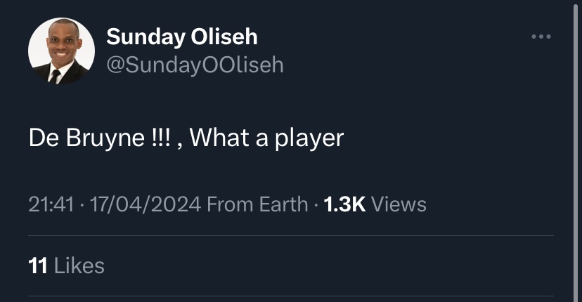 In response to De Bruyne's performance, Oliseh took to his social media platform, X (formerly Twitter) to praise Man City’s captain, acknowledging his exceptional abilities as a player.