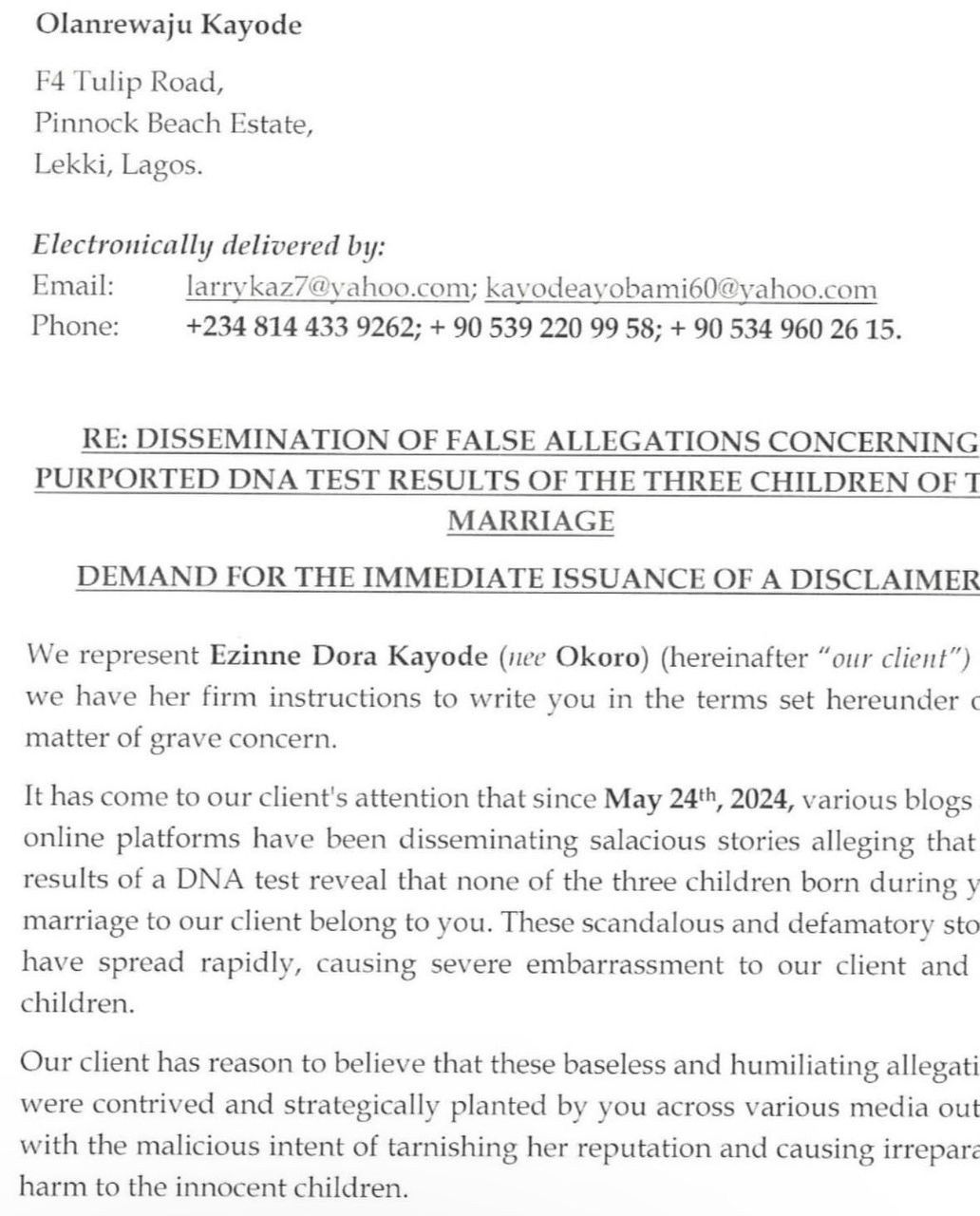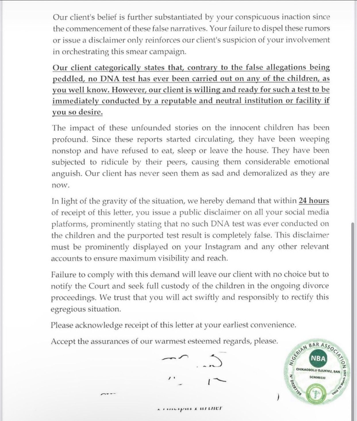 In the letter, Dora stated, “no DNA test has ever been carried out on any of the children, as you well know. However, our client is willing and ready for such a test to be immediately conducted by a reputable and neutral instituition or facility if you so desire”.