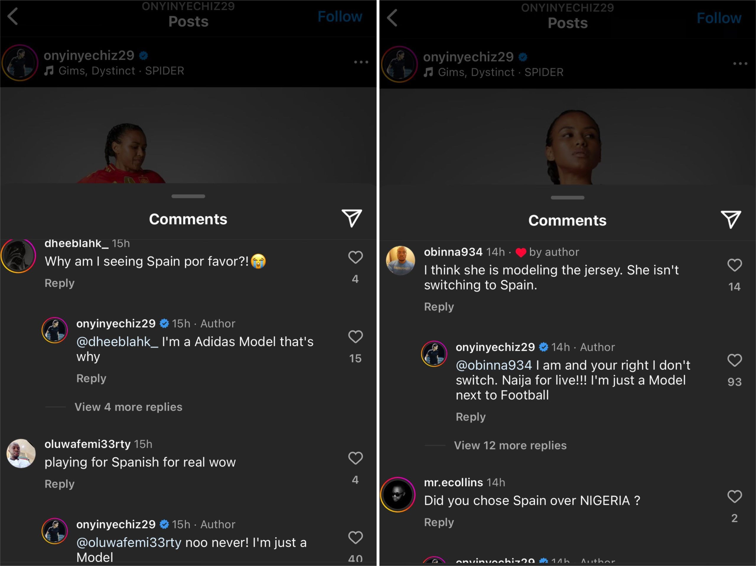 The pictures garnered several reactions from Nigerian football fans, who got the impression that she might have opted to play for Spain at the international level, instead of the Nigerian women’s national team.
