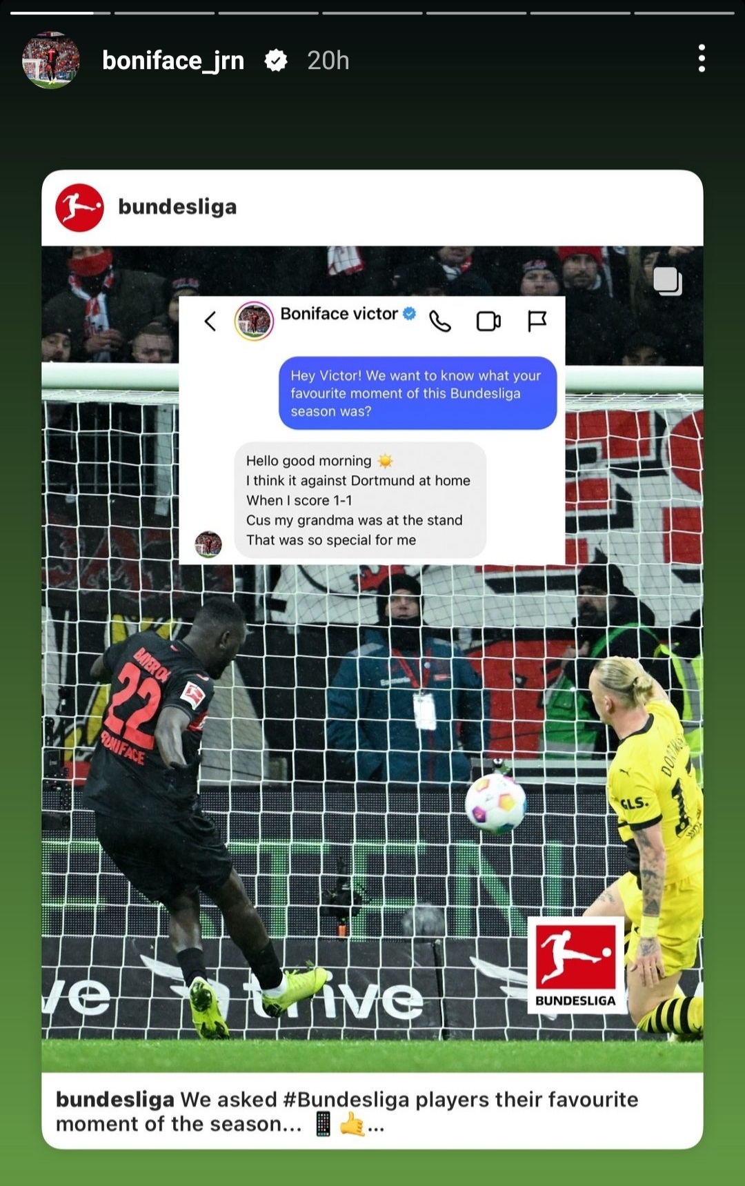 Super Eagles striker Victor Boniface has revealed that his best goal of the just-concluded Bundesliga season was his equalizer for Bayer Leverkusen in their week 13 1-1 draw against Borussia Dortmund, Soccernet.ng reports.