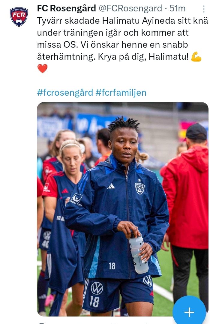 In a statement, Rosengard FC expressed their disappointment and wished her a speedy recovery.