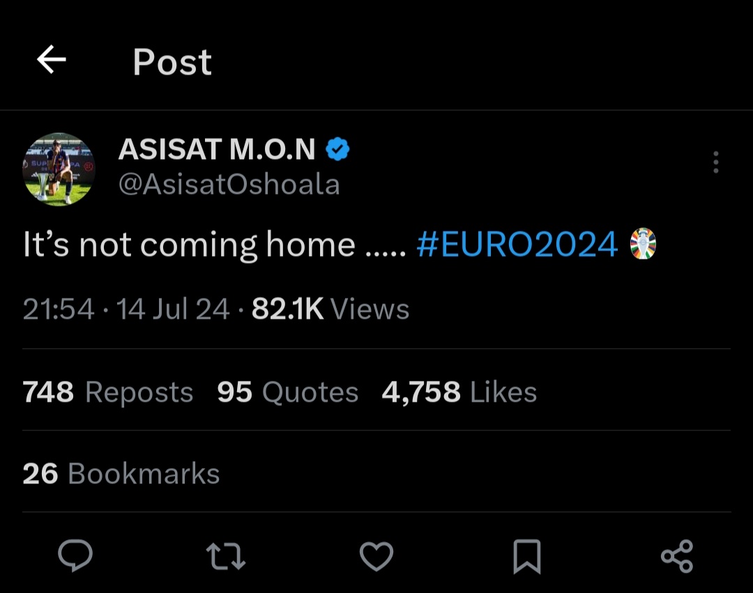 She also trolled the English, using their famous “It's coming home” against them. Oshoala wrote, “It’s not coming home” on X.