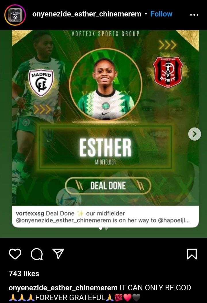 Madrid CFF also confirmed the transfer, stating, “Esther Onyenezide Chinemerem is on her way to Hapoel.”