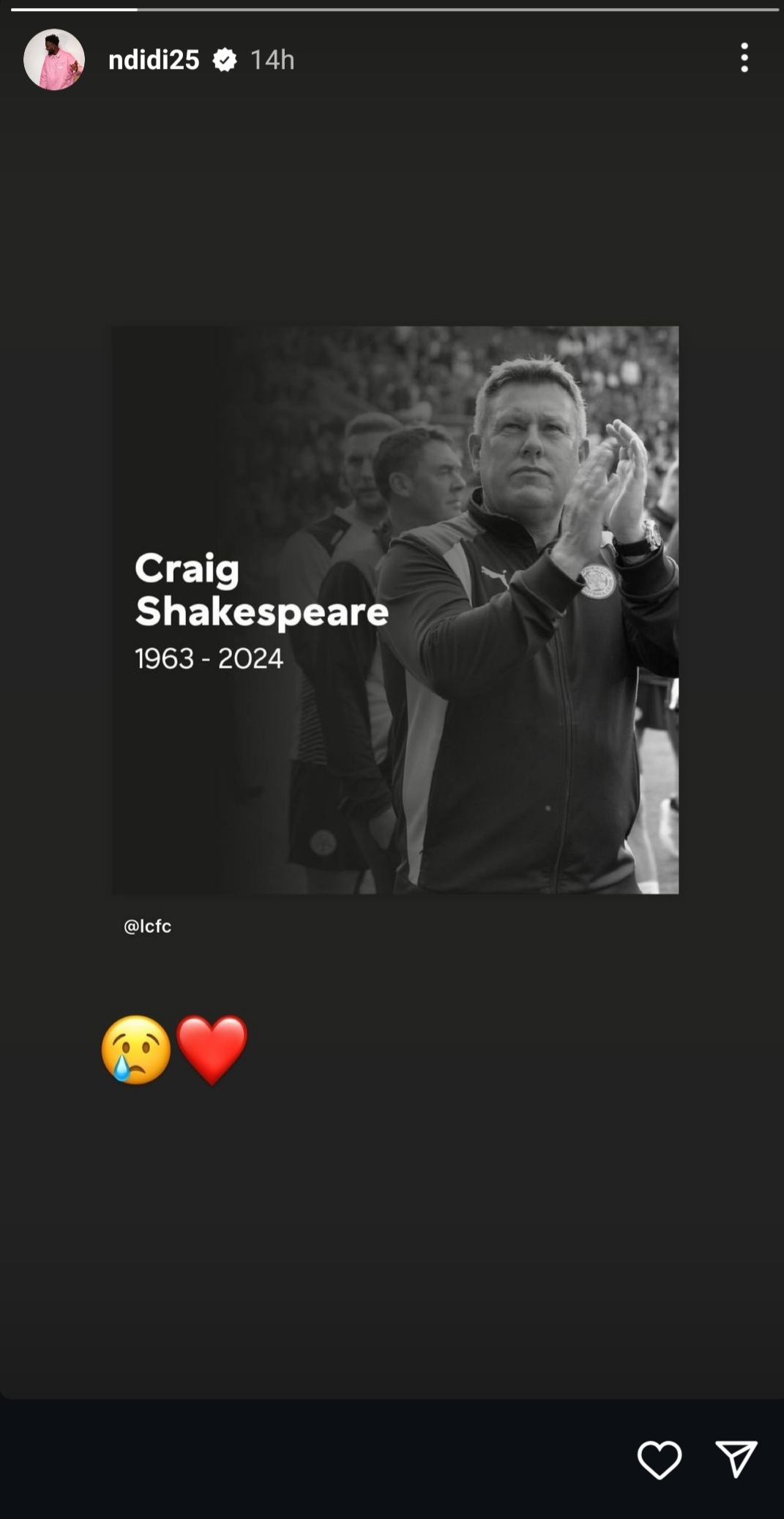 Super Eagles star Wilfred Ndidi has taken to social media to mourn the loss of former Leicester City coach Craig Shakespeare, Soccernet.ng reports.