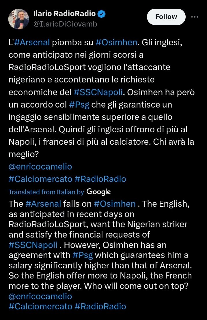 According to reports from Italy-based Radio Radio, Arsenal have proposed a higher transfer fee for Osimhen compared to PSG, although the salary package on offer is lower. Napoli, keen to expedite negotiations, are hopeful that this offer will help move the deal forward.