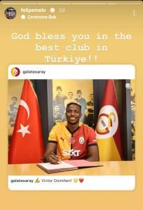 Dedicating an Instagram ‘story' to Osimhen, Melo wrote: “God bless you in the best club in Turkey.”