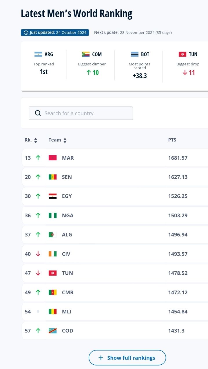 This rise sees Nigeria climb above the 2023 Africa Cup of Nations winners Cote d'Ivoire and Tunisia who both drop out of the continent's top five.