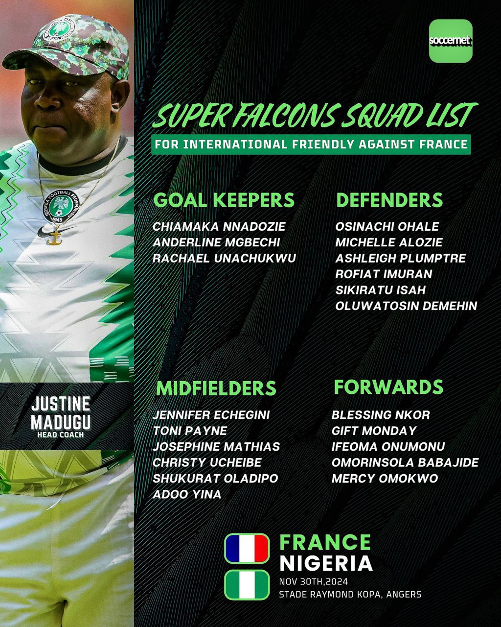 The Nigeria Football Federation has announced the call-up of 20 players for the Super Falcons’ upcoming international friendly against the France women's national team this week, Soccernet.ng reports.
