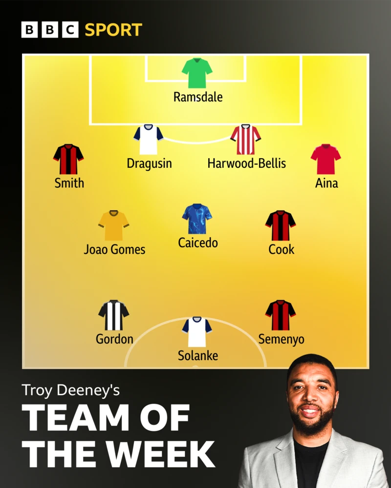 Tottenham Hotspur's Radu Dragusin and Southampton's Taylor Harwood-Bellis complete the centre-back pair, while Ola Aina seals the left-back spot after scoring a stunner in Nottingham Forest's 3-0 win against West Ham United.
