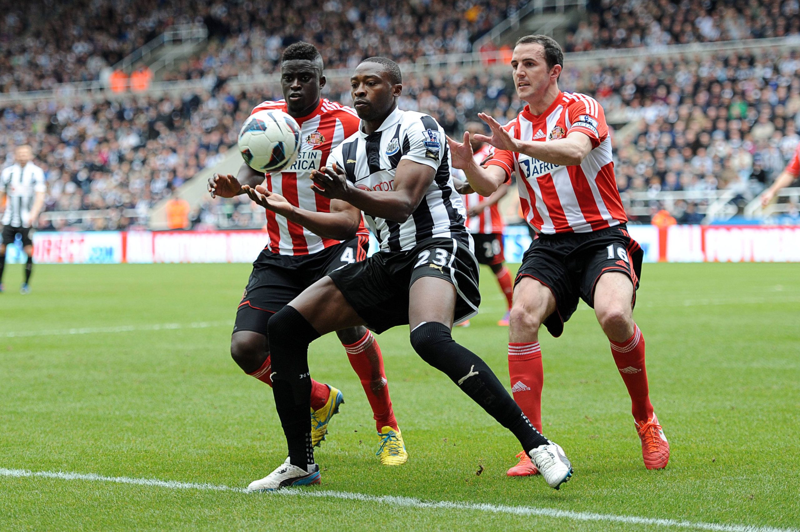Image number 13382530 date 14 04 2013 Copyright imago Color Sports Football Premier League Newcastle United vs AFC Sunderland Alfred n Diaye and John o Shea AFC Sunderland Close Down Shola Ameobi Newcastle United AT St James Park Football England Premier League 2012 2013 xns x1x 2013 horizontal. [Photo Credit/ Imago].
