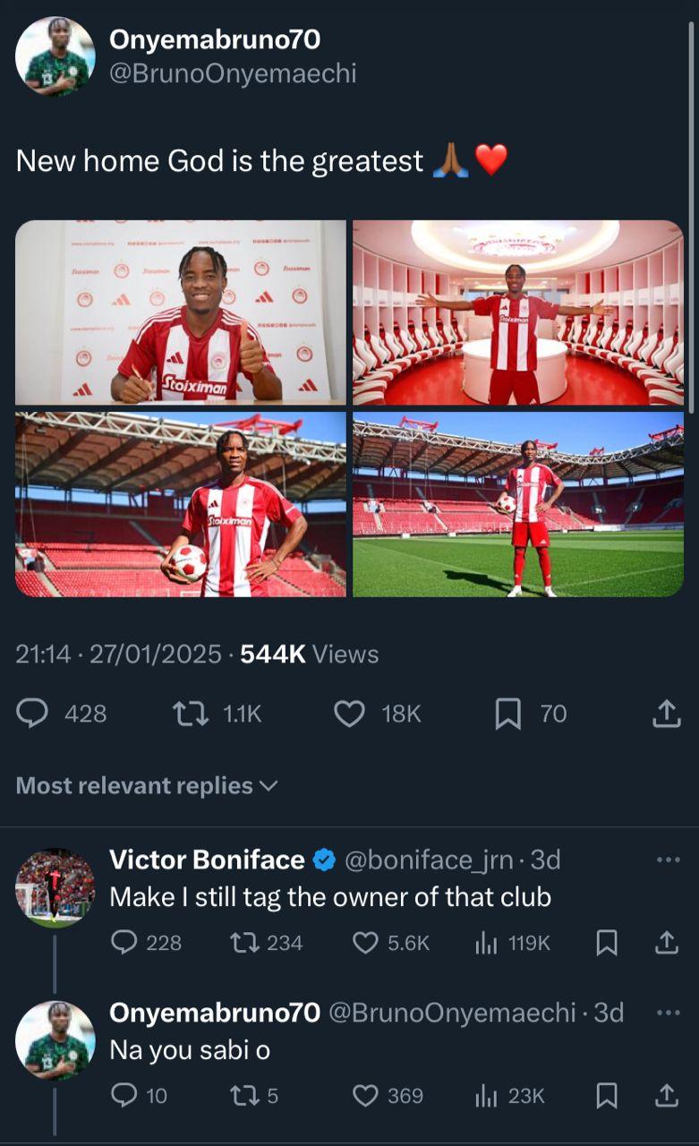 However, Onyemaechi later claimed his account had been hacked and dismissed the post. Despite this, the moment stuck with fellow Super Eagles star Victor Boniface, who playfully referenced it when congratulating Onyemaechi on his move to Olympiacos.