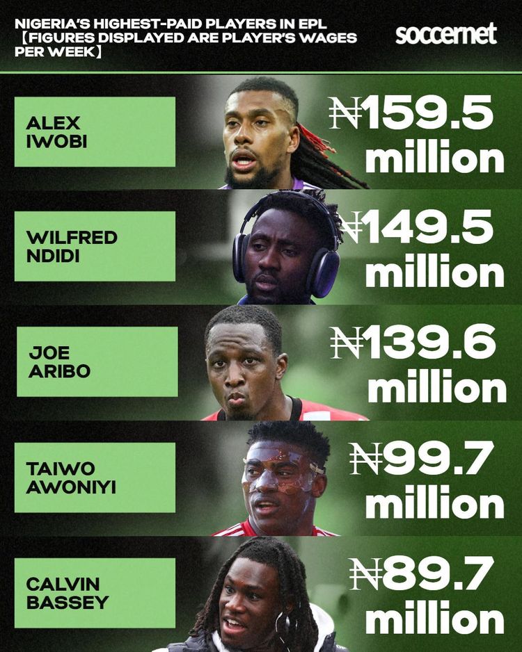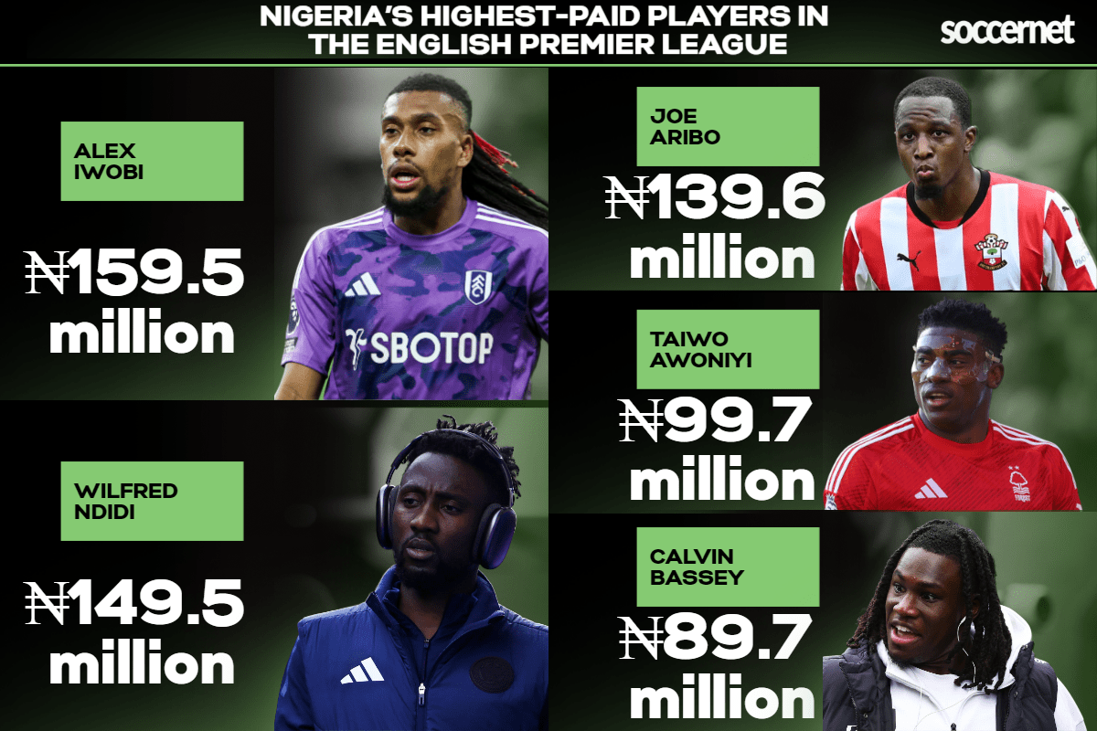 So, who is Nigeria’s best-paid footballer in the English Premier League today? Let’s take a closer look — from the bottom of the pay scale to the very top, as per Capology.