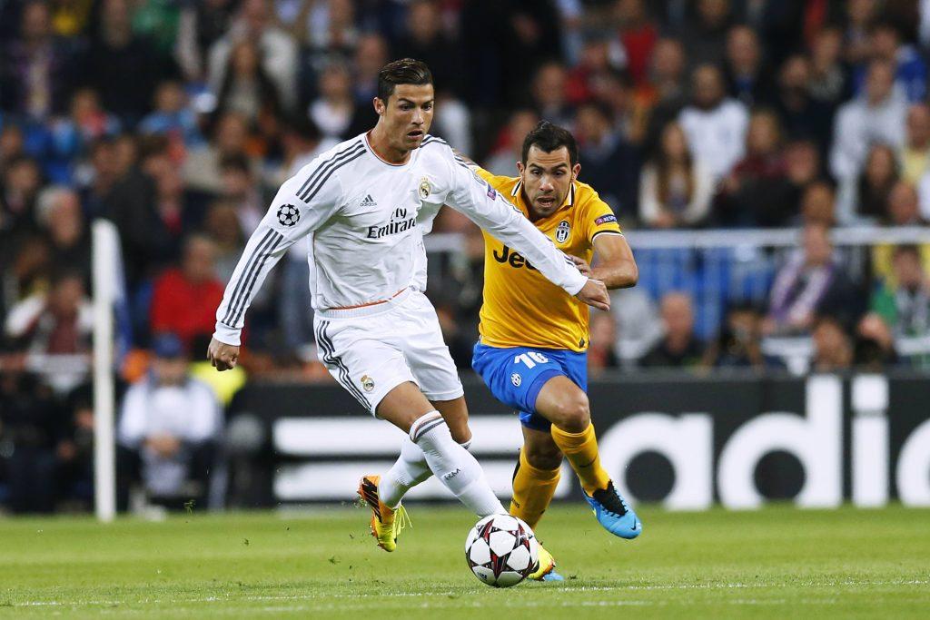 Cristiano Ronaldo (Real), Carlos Tevez (Juventus), OCTOBER 23, 2013. UEFA Champions League Group B match between Real Madrid 2-1 Juventus at Estadio Santiago Bernabeu in Madrid, Spain. [Photo Credit/ Imago].