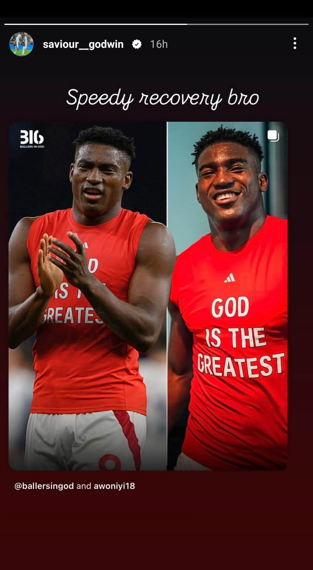 Galatasaray star Victor Osimhen shared a picture of Awoniyi on Instagram and wrote, “Prayers up for you brother. God will never leave you.”