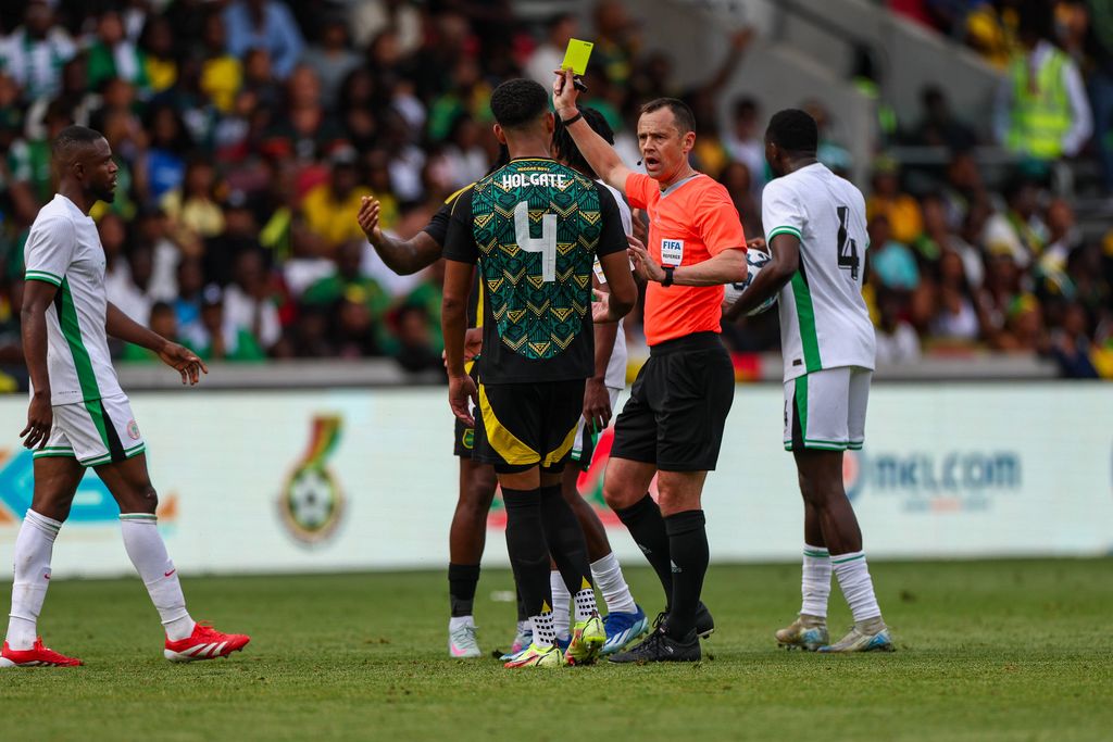 Referee, Stuart Atwall, gives Jamaica midfielder Kasey Palmer a yellow card for a bad foul during the Unity Cup Final, London 2025. [Photo Credit/ Imago].8. Nathan Tella 6/10: The Bayer 04 Leverkusen winger, on his second appearance for the Super Eagles, looked out of position and struggled to impress. He made way for Tolu Arokodare in the 65th minute.