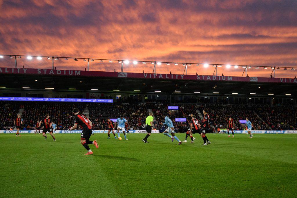 The sun sets behind the stadium as Taiwo Awoniyi controls the ball during the Premier League match between Bournemouth and Nottingham Forest at the Vitality Stadium. [Photo Credit/ Imago].