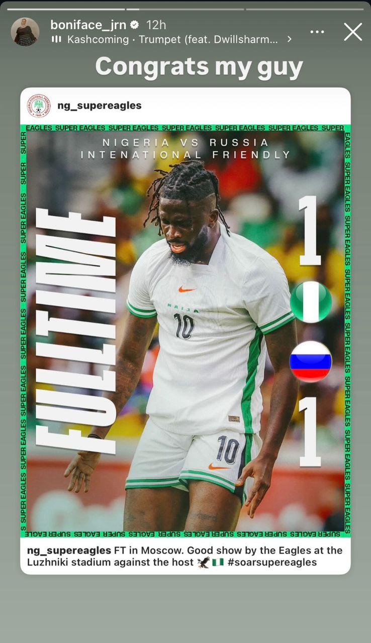 Following the game, Boniface shared a brief message on his Instagram story, writing: “Congrats my guy” in reference to Arokodare’s debut goal.