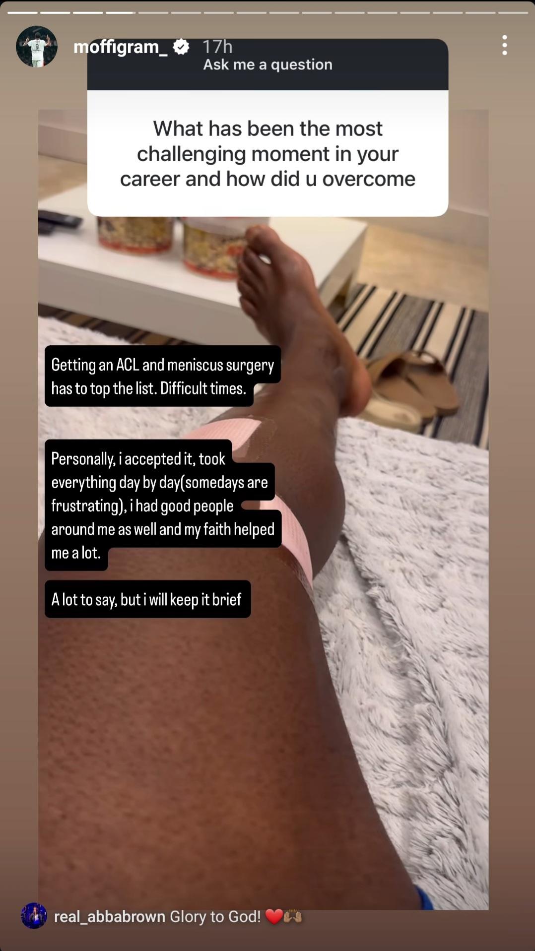 “Getting an ACL and a meniscus surgery has to be top of the list. Those were difficult times,” Moffi wrote on Instagram.