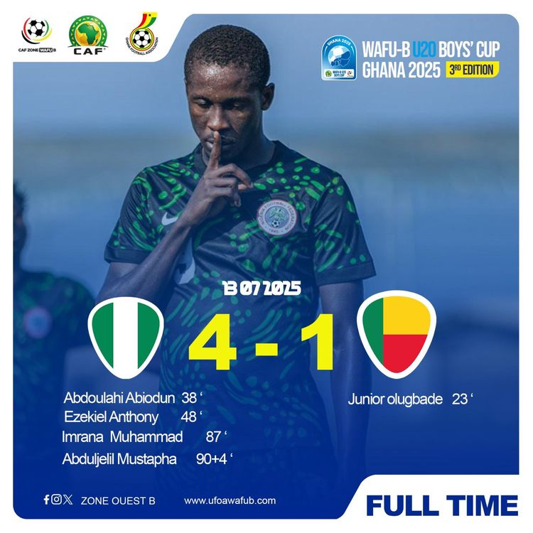 Nigeria's Flying Eagles delivered a ruthless attacking performance to overpower Benin Republic 4-1 in their second Group A match at the WAFU B U20 Boys Championship in Prampram, Ghana, Soccernet.ng reports.