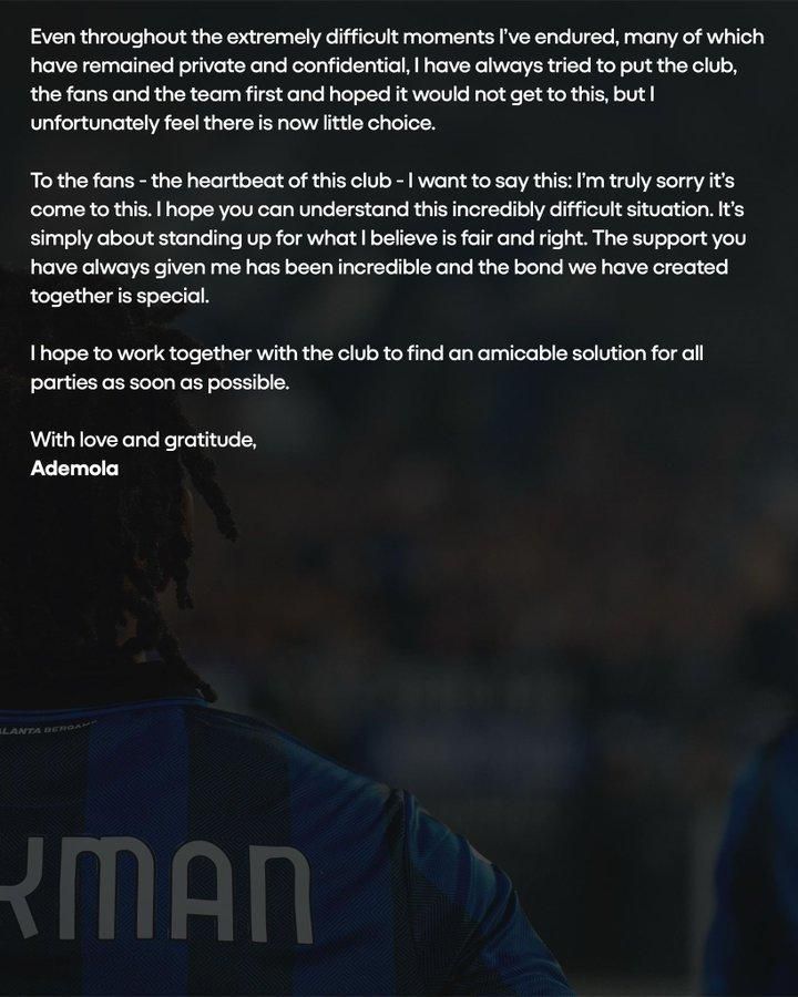 Lookman also confirmed that he sent in a transfer request on social media, as he penned a message to Atalanta fans.