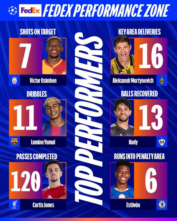 The governing body’s data also listed Barcelona’s Lamine Yamal as the top dribbler (11 dribbles), Liverpool’s Curtis Jones as the most accurate passer (120 completed passes), and Chelsea’s Estavio for most runs into the penalty area (six). Qarabag's Kady Borges led ball recoveries (13), while Kairat's Aleksandr Martynovich topped the charts for key area deliveries (16).