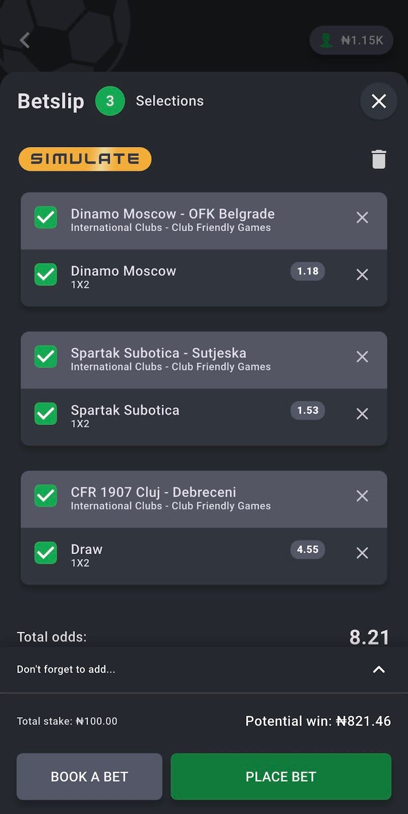 - Once you're done picking, click on BETSLIP from the bottom navigation bar to view your selection and specify the bet amount (minimum stake amount is ₦10).