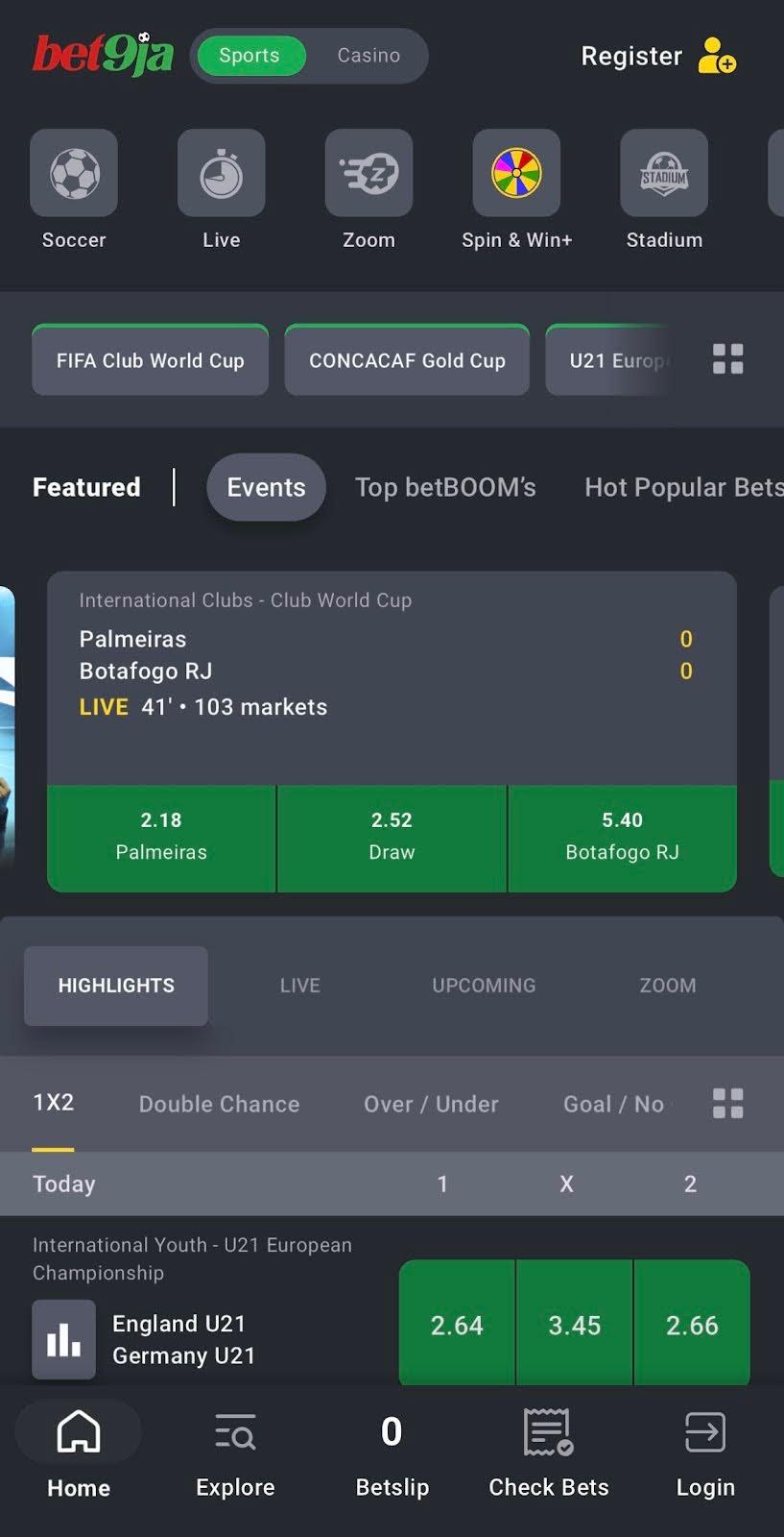 Open the Bet9ja app on your Android or iOS devices and click on REGISTER on the top right corner of the homepage.